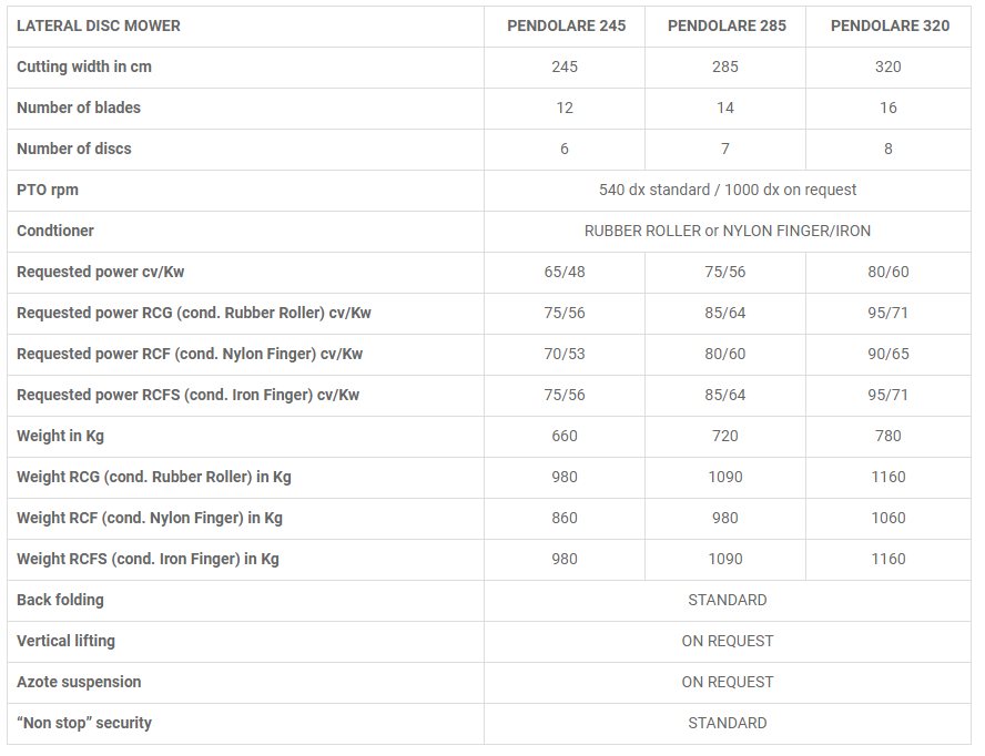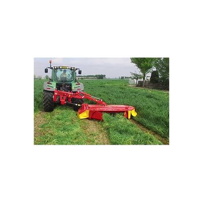 Lateral disc mower coupled to the tractor with 3-point linkage. Side mower coupled with the tractor with three-point connection, second category. The primary transmission is made by a multiplier in an oil bath placed under the attack of the rudder, while the secondary transmission is made by gears in an oil bath. The cutting unit consists in a central pendulum suspension with double shock springs that allows a constant adjustment of the weight on the ground and allows to the cutting bar to follow the soil profile for a clean cut.