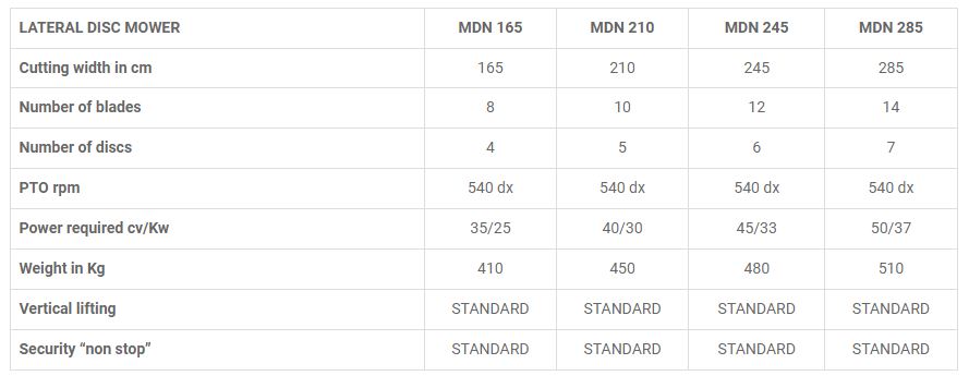 Lateral mower coupled to the tractor with the 3 point of the tractor, first and second category. Renewed in aesthetics and reinforced in the structure the MDN mower models have been developed to meet increasingly demanding working conditions, dictated by ever-widening surfaces and smaller working times, to the benefit of productivity.. The primary transmission takes place through four SPBX toothed belts, while the secondary gear is used with oil bath gears.