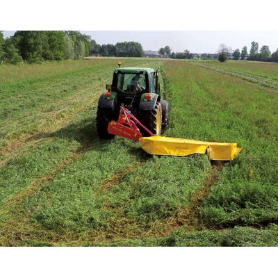 The articulated point at the centre of the drums permits perfect adaptability to all ground conditions, also preventing the squashing of the sward, even in the event of working conditions over very sloping ground. All the transmission elements and the gearing are enclosed in a oil bath box. The transportation system of the lateral mowers means that the barycentre of the machine can be significantly moved towards the tractor. The lenght range is considerably reduced, and the weight of the machine is shifted towards the tractor thereby facilitating transportation.