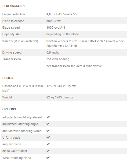 This innovative machine was mainly designed to mechanize making lawn edges. The technique used is that of a stabbing knife. In this case, the knife makes horizontal stabbing motions where a small sod at the edge of the lawn is cut away and this creates a smooth edge that gets the shape of the knife.