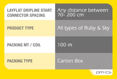 PM Group offers a range of start connectors for lay-flat pipes, for easy connection of drip lines or tape to the lay-flat main pipe. PM Start Connector are press fit style and allow the line to be dismantled easily from starter at the end of the season. The starter base low profile enables the user to roll the lay-flat pipe with the starters on them in a compact manner and store easily while saving considerable space. Suitable for seasonal and portable applications.