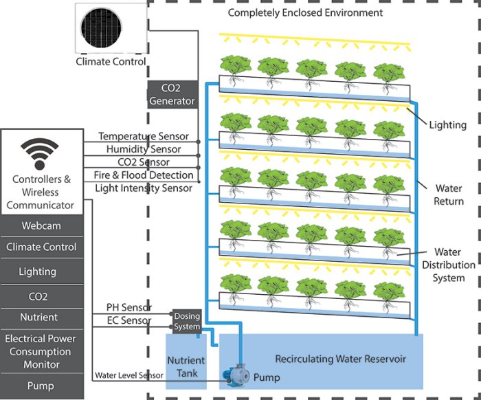 Monitor and adjust every element of the growing system from a tablet or smartphone, including lighting, CO2, Nutrients, PH, Air Temperature, Humidity, Fans, Water Temperature, Water Flow, Water Levels and Root Zone Temperature. Includes a Webcam, so you may view your crops from anywhere in the world.