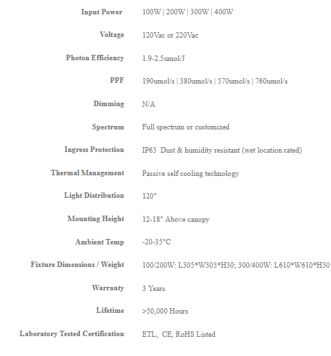 - High efficacy spectrum for precise grow, PPE up to 3.0umol/J.