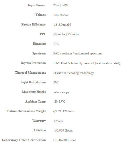 The Horti-I series is ideal for high wire plants, to place lighting within the canopy and focuses growth-stimulating light on the most vital part of the crop. It can be especially beneficial for increasing yields of e.g. tomatoes and cucumbers. Related research clearly show that supplemental LED inter-lighting could efficiently compensate for a shortage of light for plant growth, photosynthesis and thus yield under the lack of sunshine. This vertical inter-canopy lighting is design for high wire cultivation of greenhouse vegetables and is installed within the crop to supplement existing top lighting.
