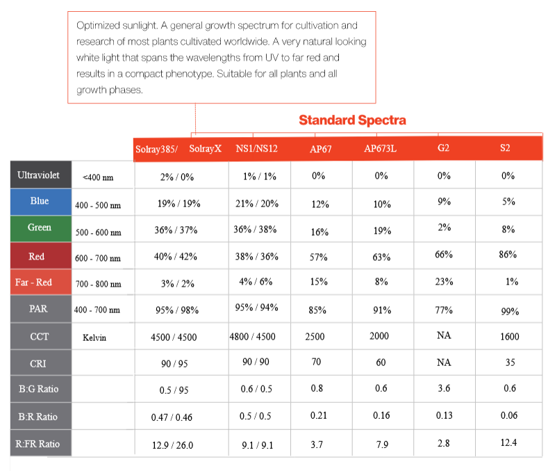 Below is the list of our standard spectra. Before commercialisation they have undergone rigorous research in collaboration with world’s leading universities and research institutes in order to create light that is optimal for plants, that speeds up their growth cycles and results in strong, healthy and nutrient dense plants.