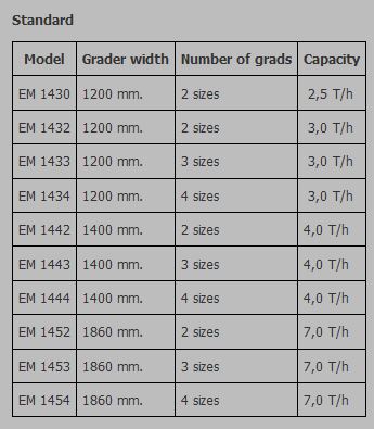 EM 1430-1454 length graders for carrots have capacities from3-8 t/h.?The machines grade the carrots by length over stainless vibrating riddles with infinitely adjustable spacing.?The machine is designed in such a way that the carrots do not accumulate in the riddles, and it is available with 2, 3, or 4 grading.?The length graders are delivered complete with internal electricity and are prepared for transverse belts for the individual grading.