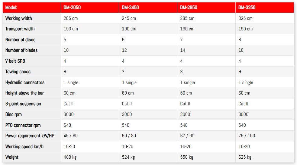 The very solid cutter bar from Italian Comer runs in a sealed oil bath with the option to service the individual discs separately. The DM-3250 has 8 discs and extra reinforcement under the cutter bar.