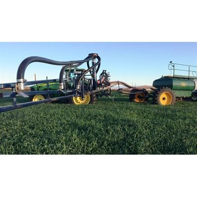 In some cases three point linkage and trailed air spreader booms are able to pull existing air seeder carts, spreading swaths up to 30m. However, the 36m trailed machines will require higher output air driven distribution units than currently available for normal seeding operations and will have 7-10 ton hoppers mounted on the trailer.