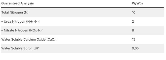 Calborzer is contents 10% N, %15 CaO and % 0,05 B. Calborzer is a high-performance, water-soluble fertilizer formulated to ensure the calcium and boron requirements of plants in the generative growth cycle.