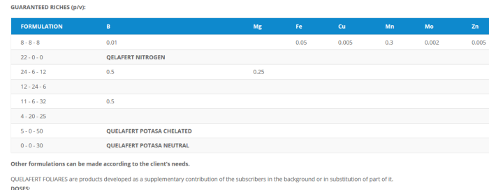 Different foliar formulations enriched with microelements (iron, copper, zinc, manganese chelateds, and boron and molybdenum in mineral form), of easy application and dissolution. They are formulations developed to apply them in the different stadiums of development of fruit trees and horticultural crops.