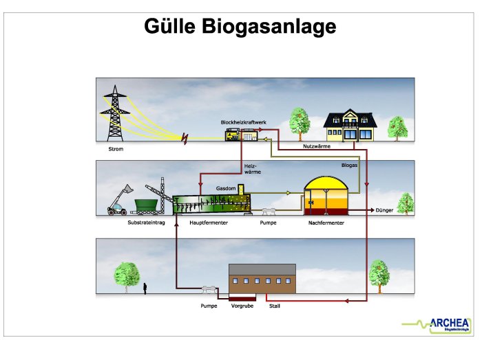 The ARCHEA`s biogas plants for liquid manure was specially developed for it`s use with at least 80% of animal manure and energy crops, as well as with waste from food production.