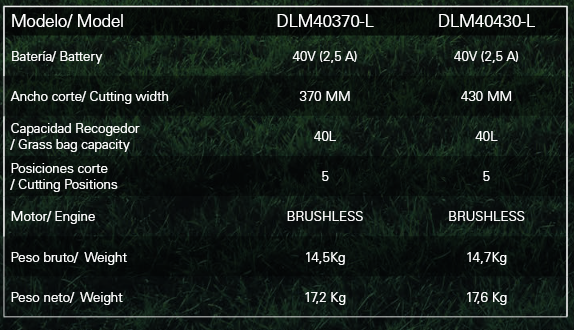 Bateria/ Battery 40V (2,5 A). Ancho corte/ Cutting width 370 MM. Capacidad Recogedor / Grass bag capacity 40L. Posiciones corte / Cutting Positions 5. Motor/ Engin BRUSHLE. Peso bruto/ Weig 14,5K. Peso neto/ Weight 17,2 K CE-GS Certification. Samsung technology .