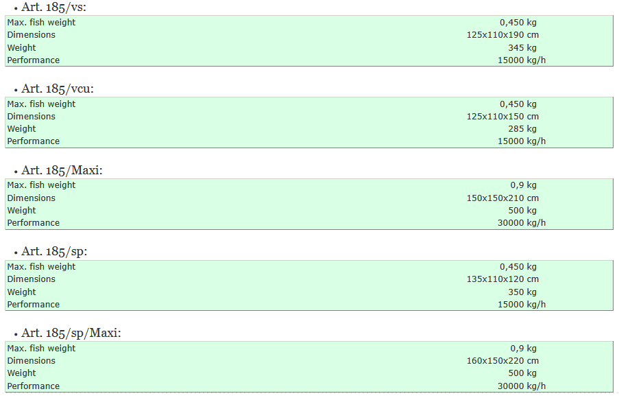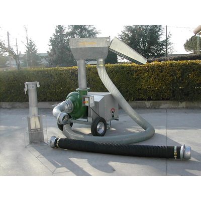 Patented central body in anticorrosive alluminium league, device water/fish in hot galvanized steel with internal gille, turn variator to rev for different sizes of fish, electric motor 5,5 hp, volts 220/400 threephases or different at request, hot galvanized steel truck with wheels, 2 mt long flexible sucking hose diam. 150 mm, stainless steel valve, bends, pipe fittings and all accessories. Discharging steel pipe diam. 150 mm and long 1 m (if requested it is possible to joint further flexible hose).