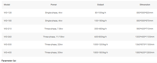 This machine is mainly composed of the power unit, inlet and outlet, press roller, and pressing plate. Among them, the power unit can be driven by an all-copper motor or a diesel engine. It is equipped with a geared motor, which can obtain greater torque while reducing the speed. The size of the discharge port can be customized according to customer needs.