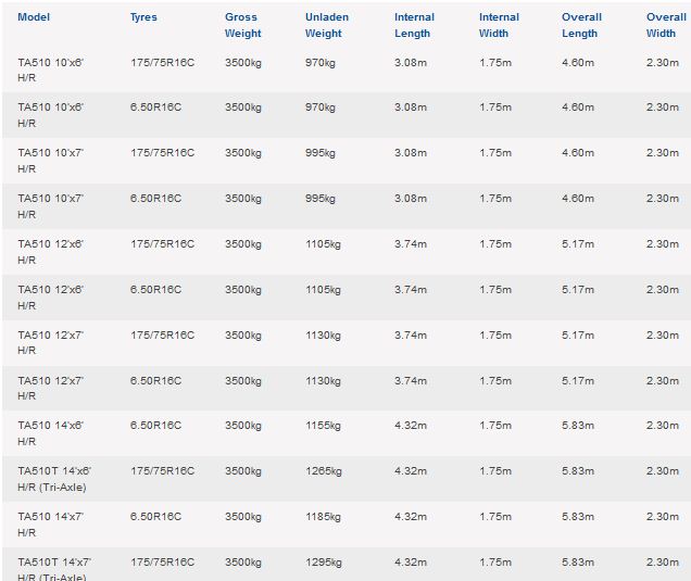 The TA510 range offers substantial high specification trailers, designed for those who require the maximum volume and gross weight available. Body lengths of 10’, 12’ and 14’ are available, with height options of 6’ and 7’. The 7’ versions, with optional centre partition fitted, allow two 16.2hh horses to be transported. All trailers have a maximum gross weight of 3500kg; payload varies between 2010kg and 2550kg depending on size and specification. All sizes are available with either the standard ramp, combination ramp doors or with the EasyLoadramp and folding deck system. TA510 trailers are fitted with a twin axle beam (tri-axle option on 14’ model), leaf sprung suspension, galvanized steel chassis, aluminium side panels, heat reflecting roof, and grip-faced aluminium planking covered rear ramp.