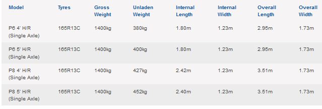 With a maximum gross weight of 1400kg, they can be towed by most large family cars. They provide a payload of 1010kg for the 6’ version and 960kg for the 8’ version. Both models offer 4’ and 5’ of headroom with a width of 4’.