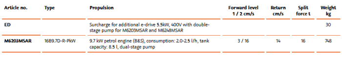 - Mobile on axle with ball hitch, max. transport speed 80 km/h; lights. For transport, the splitter is put in the transport position by means of a rope winch.