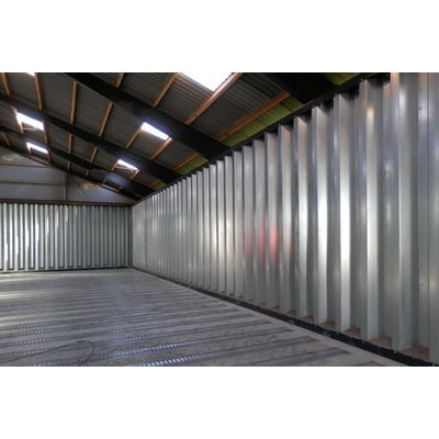 The trapezoidal walls can be mounted as interior walls in existing buildings that are not already dimensioned for grain pressure. Alternatively, the trapezoidal walls can be mounted as exterior walls. The exterior walls are powder coated in a color as desired, so that they fit harmoniously with the farm’s existing buildings. See more examples of both interior and exterior trapezoidal walls under references.