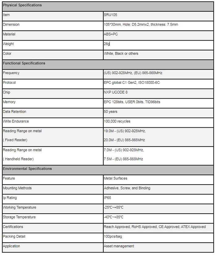 SRU105 is passive rfid metal tag with long reading distance up to 20 meter read by fixed reader. These long range tags are using the 2865-868 MHz frequencies. Long range tags are ideal for tracking large or high value assets across large areas and spaces.