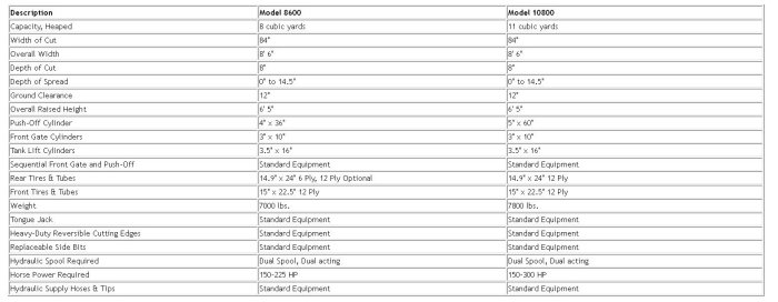 The Lorenz Earth Mover is available in two models - the L8600 and L10800. They are the push-off type, with double acting hydraulics. The front axle is mounted to a heavy duty swivel with stress proof pins. All axle spindles are bolted in place for easy removal. The hydraulic cylinders are heavy duty and well protected. The cutting edges are reversible and replaceable. The center section cutting edge is larger for better heaping during loading. The pivot arms and brackets are made from heavy plate to withstand heavy use.
