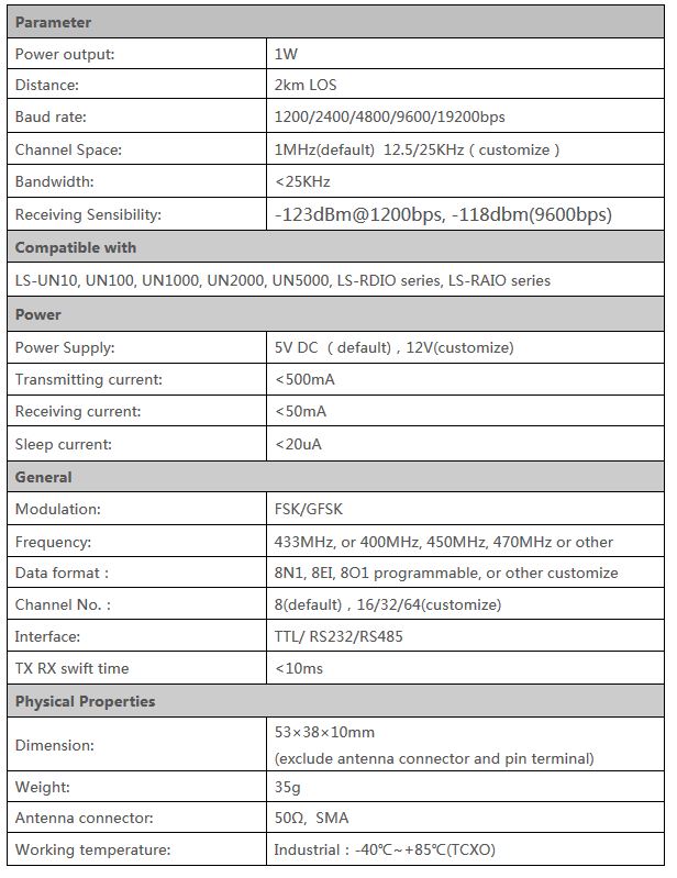 LS-U1000; Power output:1W. Frequency:433MHz free band or other customize. Power Supply:5V DC. Distance:2km. Interface:RS232/RS485/TTL .