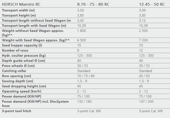 The Maestro RC is designed for being attached to a seed waggon (Pronto AS) - for efficient and flexible single grain sowing. The combinaton of Maestro RC and SW 3500 excels due to its flexible equipment versions and its driving comfort.Chassis: The large chassis offers excellent driving comfort. 3-point mounting: The 3-point mounting allows for attaching a TurboDisc seed bar in addition. The seedwaggon, thus, can also be used for sowing cereals.Front tools: Contrary to the Maestro CC, the RC in combination with the SW 3500 is (like the Pronto) isequipped with a 2-row DiscSystem allowing for combining seedbed preparation with sowing.