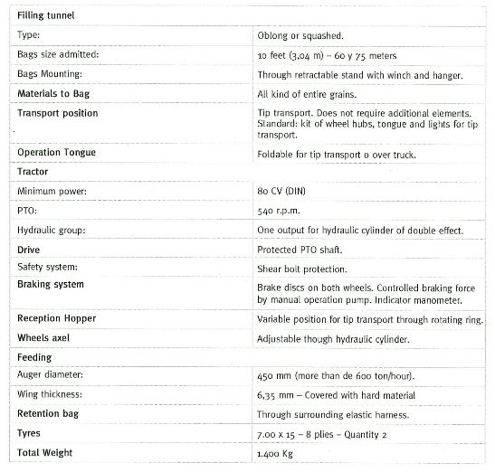 For bag mounting it has a retractile support (parallelogram shape) embedded inside the tunnel. It receives a hanger which elevates the bag by means of a hand winch. The winch is located on the side of the auger, thus it is not necessary to climb on the tunnel to elevate the bag. The hanger achieves its purpose without balancing and no help is needed. Once in position, the bag is placed on the tunnel and the hanger is removed.