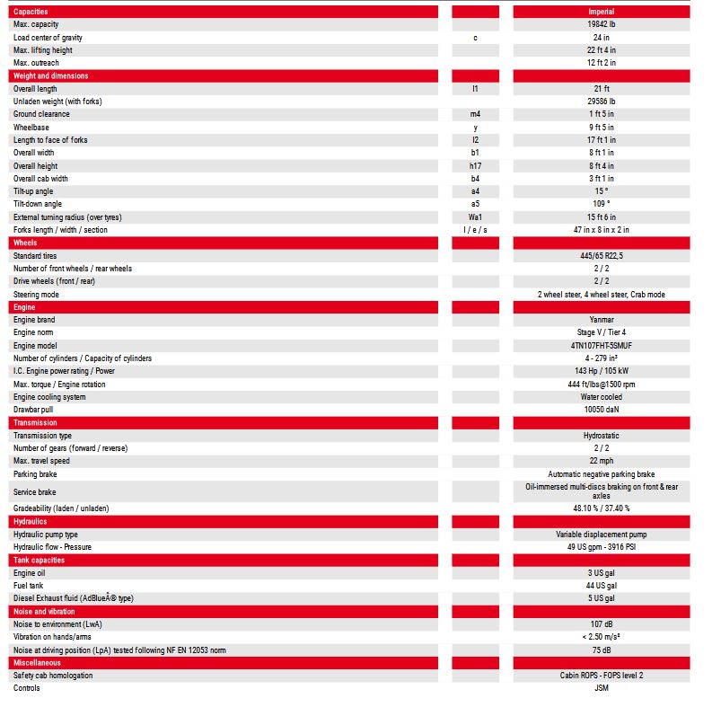The MHT 790 is a telescopic handler with a capacity of 9 tonnes and a maximum lifting height of 7 metres. It is equipped with a 145 hp engine and a hydrostatic transmission that makes the movements extremely precise. Thanks to the 4 driving and steering wheels, it is easy to manoeuvre on all types of terrain in complete safety. The MHT 790 telescopic handler is used in construction, quarries and industry. It can be equipped with a wide range of attachments: forks, positioner, hook and winch, shovel, man basket and tyre grippers, cylinders and tubes. For maximum comfort, this machine is equipped with a panoramic, ergonomic cab, Easy Step access, JSM joystick and colour touch-screen display.