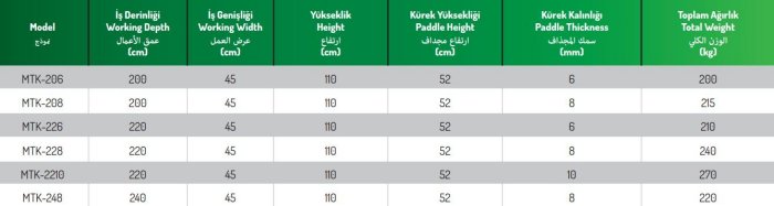 Model : MTK-2G6. Working Depth : 2GG. Working Width : 45. Height : 110. Paddle Height : 52. Paddle Thickness : 6. Total Weight : 2GG.