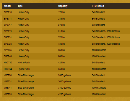 The 3700 Series Manure Spreaders by Massey Ferguson. Whether you have 50 dairy cows in a loafing barn or you’re finishing 15,000 beef steers in your feedlot, the 3700 Series has exactly the manure spreader you need. No doubt about it. We`ve got a big spread of spreaders. Choose from 14 innovative models from 105 to 479 cubic ft. (175 to 660 bushels) in 3 configurations - plus a wide range of options.