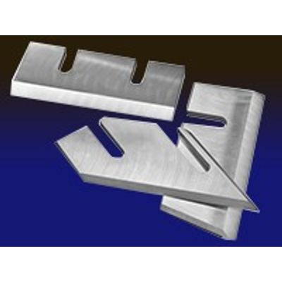 Examples shown for a wood chipping machine 2 Rotor knives and a fixed blade. Manufactured from sintered CPM4V materials hardened and triple tempered to Rc 63/66. Serrated face allows for location and adjustment after resharpening Rc 63/66 hardened blades will last 10 times longer than standard carbon steel. Reducing the cost of downtime when re-tooling.