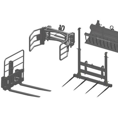 Material handling: Peaks frontal boots and 3 point, Ball clamps, Pallet lifts and lift bag, Forks and grapple buckets, Front and 3 point buckets, Silage blades.