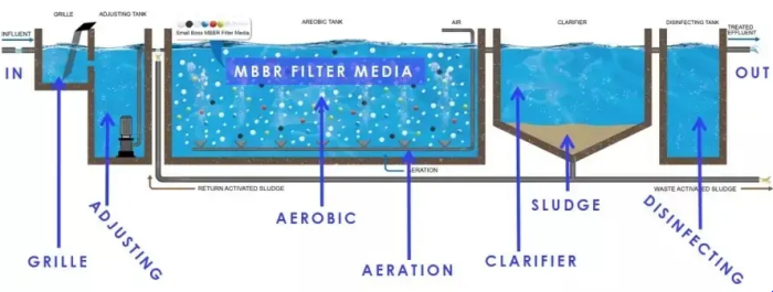 The MBBR process utilizes floating plastic carriers (media) within the aeration tank to increase the amount of microorganisms available to treat the wastewater. The microorganisms consume organic material. The media provides increased surface area for the biological microorganisms to attach to and grow in the aeration tanks. The increased surface area reduces the footprint of the tanks required to treat the wastewater. The media is continuously agitated by bubbles from the aeration system that adds oxygen at the bottom of the first compartment of the aeration tank. The microorganisms consume organic material. When compared to conventional secondary treatment it provides superior efficiency and value.