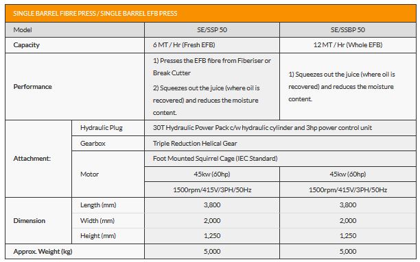 In the primary stage, the EFB Single Barrel Press is used to squeeze out the remaining oil and reduce the moisture content in Empty Fruit Bunch (EFB). The recovered mixture of oil and moisture is then separated through the Oil Separation System.