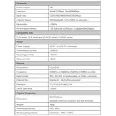 Power output:1W. Frequency:433MHz free band or other customize. Power Supply:5V DC. Distance:2km-3m. Interface:RS232/RS485/TTL .