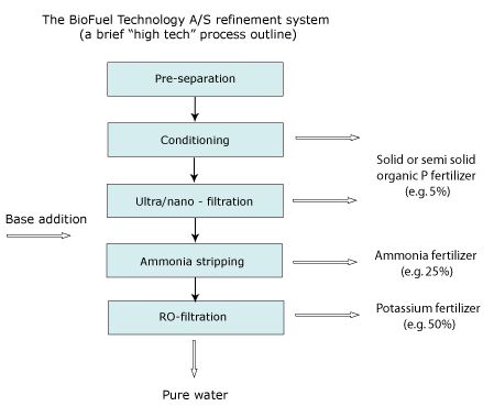 Animal manure, such as pig and cattle slurry, is a dilute solution of a complex mixture of organic constituents, macro- and micro-nutrients, and various micro-organisms. However, the BioFuel Technology ApS membrane technology and refinement processes can refine the slurry, whether raw or anaerobically digested, to concentrated fertilizes and pure water at competitive costs.