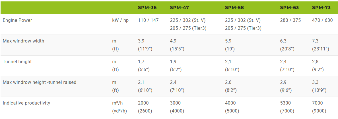 Engine Power:, kW / hp, 110 / 147, 225 / 302 (St. V), 205 / 275 (Tier3), 225 / 302 (St. V), 205 / 275 (Tier3), 280 / 375, 470 / 630.