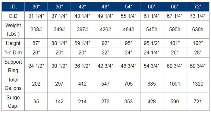 Fiberglass surge tanks are superior to any other material because it is extremely corrosion resistant.Surge tanks are generally required on gutter pools to allow a “storage” space for water displaced by swimmers. The preferred arrangement is to hold-back (“modulate”) the water from the main drain pipe so that water entering the gutters can flow to the surge tank and not back up in the pool. This is done with a float ball control on a butterfly type valve mounted on the main drain line. Modulating the main drain line insures that the debris that normally accumulates on the surface of the pool will be swept quickly to the filters. The schematics below show the general arrangement of various type surge systems. The surge tank can be a built in place concrete vault or a closed top tank, vented to a point above pool water level. It is also common to find vacuum D.E. filter components installed in a field constructed concrete tank which also acts as a surge tank. The volume of water that can be stored in the space between the normal water level in the surge tank and the pool water level is the surge capacity of the tank.