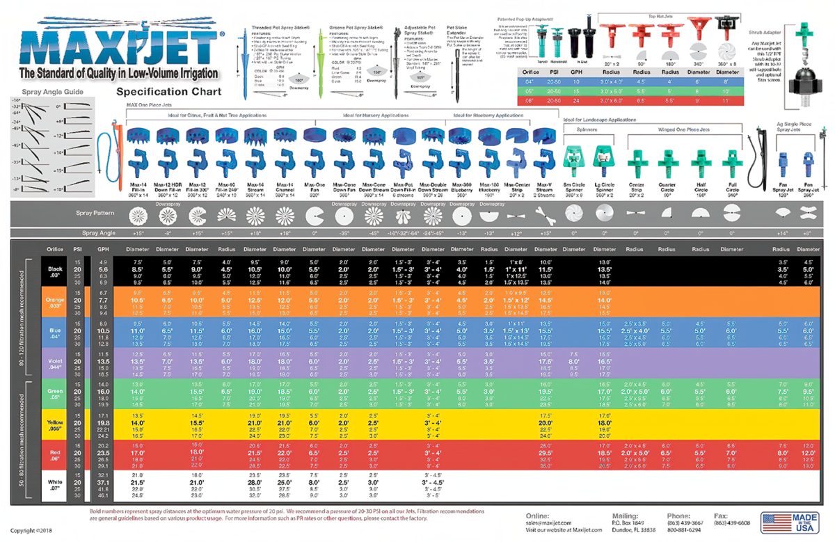 Maxijet manufactures a wide variety of Micro Sprays for Agriculture, Ornamental Nurseries, Greenhouses and Commerical Landscapes. We use the highest quality UV inhibited Resins giving you years of effecient watering of your trees and plants with our Precise Flow Rates & Spray Patterns.