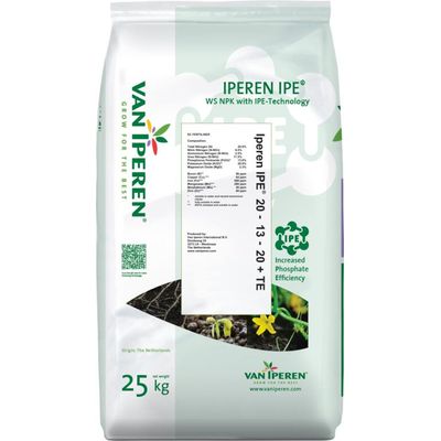 Iperen IPE | 20 - 13 - 20 + TE is a pure and balanced WS NPK combined with EDTA chelated micronutrients. Due to the Iperen IPE-Technology the Phosphate efficiency is comparable to 20 - 20 - 20 + TE which contains 30% more Phosphate. Our product has a limited caking sensitivity and is recommended at different phenological stages especially during periods root and shoot development. The IPE Technology in our formula releases soil fixated Phosphates and overcomes the precipitation of fresh applied Phosphates. The IPE-effect has been proven in many scientific trials. Today IPE Technology is used globally to better manage Phosphates needs. Produced in our own plant TTD.
