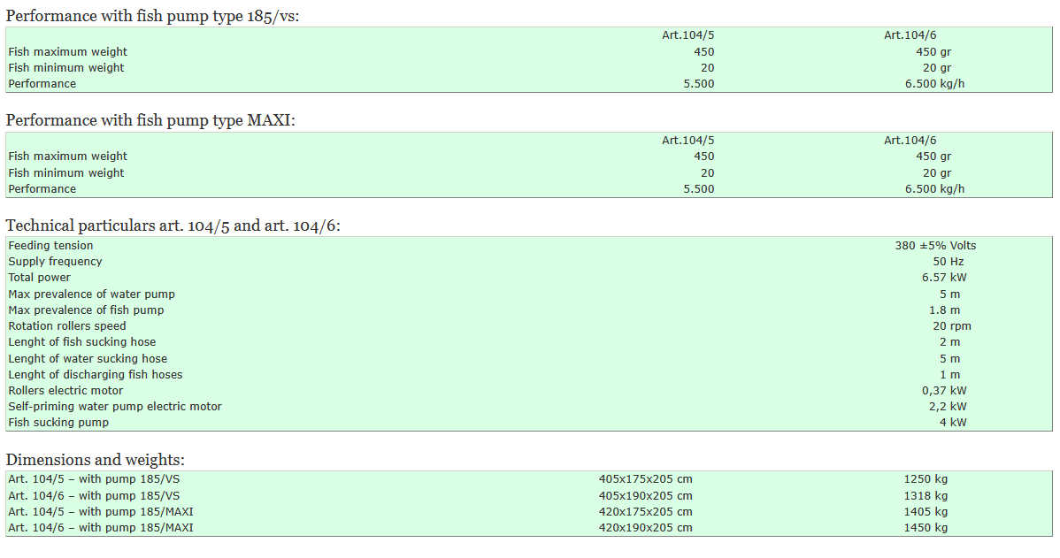 Graders with revolving rollers for live trouts and salmons with a stainless steel body built on a hot galvanized steel (at request, also frame in stainless steel). These kind of graders are equipped with a special fish pump to suck and select the fish automatically. Wheels and shaft make possible to move the graders all over the fish farm (also using a farm tractor). On one side of the grader there are some special devices adjusting rollers and bottoms to obtein three different sizes of fish contempraneously. The grader is also equipped with a self-priming water pump that feed the machine, keeping the fish alive and sliding into the discharging hoses. Complete of electric panel and accessories.