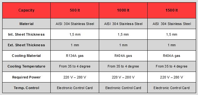 Milk cooling tanks are generally used in dairy farms in central milk collecting units. Cooling performance and capacity of tank is designed according to capacity of plant. Tanks are manufactured vertical for small capacities and horizontal for big capacities. As a standars all tanks have a CIP (cleaning in process) head inside. With this head, washing the inside of tank with circulation method so that manuel cleaning will not be needed. In this process, required chemicals and hot water should be used