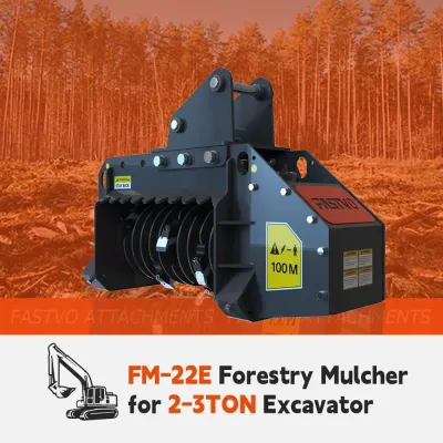 The FM-22E Mini Excavator Forestry Mulcher is a specialized mulching attachment designed for 2-3 ton mini excavators with a flow rate between 8 to 11 gallons per minute. It integrates a high-performance drive motor with a high-efficiency transmission system, ensuring robust performance in forestry applications. Operators can choose between two types of cutting tools - four-point hardened steel teeth or knife blade teeth - depending on the requirements of their tasks. This mulcher efficiently processes tree sizes up to a maximum of 4 inches. Engineered for ease of use, it features a low-maintenance variable or fixed displacement hydraulic motor and easily replaceable teeth, optimizing both cost efficiency and operational productivity. It is well-suited for challenging environments like roadsides, riverbanks, and other hard-to-reach terrains. FASTVO offers global warranty and delivery, reinforcing the mulcher's robustness and reliability in diverse geographic conditions.Most popular related searches