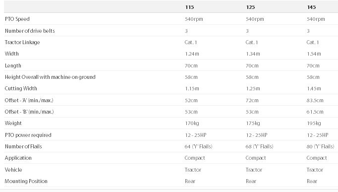 Available in three cut widths from 1.15m, 1.25m, 1.45m. Suitable for mulching light grass and general amenity areas. From 12HP to 25HP / Category 1 linkage . PTO speed 540 rpm. Rear mount only