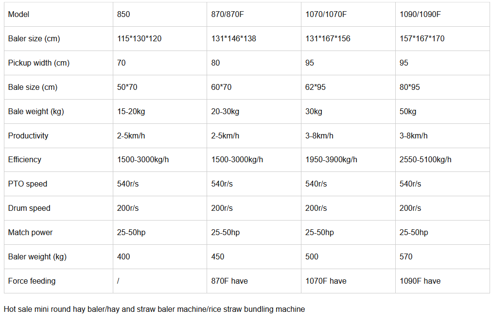 Automatic hay bundle machine is consist of main machine, pickup part, compress rolls, automatic binding hay bales, It is suitable for baling of hay, grass, wheat, silage, alfalfa and other materials such as straw etc. It can resist wind, rain and snow under open storage and is convenient for long-term storage and long distance transportation. This is a great sighificance to the prompt harverst of pasture in agricultural and pastoral areas, the efficitive use of crop stalks as well as the disaster countering and livestock protection The whole working program is successive, accurate and reliable, the bundled round grass bales compact outside and loose inside and has good air permeability. Parameters and Pictures of Mini round hay baler for sale Grass baler Green fodder baler: