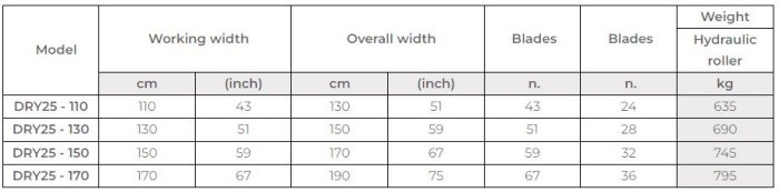 Basic machine: Stone Burier technology work system. Universal 3 point linkage Cat. 1 & 1s. Single speed gearbox 540 rpm PTO. Lateral transmission driven by chain in oil bath. Automatic chain tensioner on spring. 4x Spade blades per flange. Wearing steel protection counter-flanges. Working depth adjustable by crank handle. Rear selector rake mounted on lateral springs. Cardan shaft with shear bolt torque limiter SB type (1”3/8 Z=6 tractor side yoke). HP 30-60: cm 20, kW 23-45: inch 8.