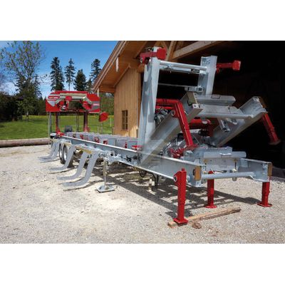 Massive 20-millimetre thick steel struts connect two 300 millimetre high I-beams and form the torsion-free foundation for extremely heavy logs. Naturally, these are hot-dip galvanized in order to ensure a long service life and retain your sawmill’s value. Stainless steel supports prevent blue staining of acidic wood species (e.g. oak and larch). The power hydraulics can easily move heavy logs into position. This allows you to quickly and easily load, rotate, shift and clamp the log. On request, the base frame can be extended to a 10-m cutting length with a hydraulically foldable extension. Other frame extensions are available.