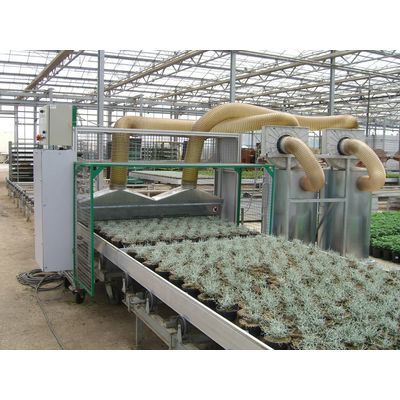 This mobile Venti system can easily be placed between mobile indoor transport systems. In this way, the logistics for the neck can be made very simple. The containers can be trimmed in both directions. The Vacuum support machine has an integrated vacuum system that lifts the shoots before cutting, thus providing a perfect fit! The cuttings are caught in a canister. They are not damaged and can be reused for sticking. Very fast truncate the mobile. Electric height adjustment of the knives. Knife length on request Standard between 1.75m and 2m. The trimmer can be moved inside the greenhouse between the container transport legs.