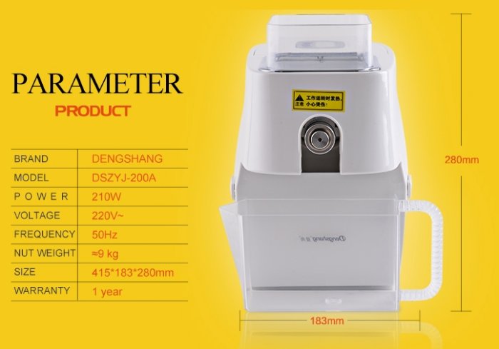 Household Oil Mill DSZYJ-200A, ABS outer shell, 220V~50hZ/110V~60Hz, Power:200W, Oil yeild rate:60%, One button finish, Manual reverse function, Commutator Motor, Multiple colors, N/G weight:8KG/8.5KG, size:610mm*360mm*310mm.