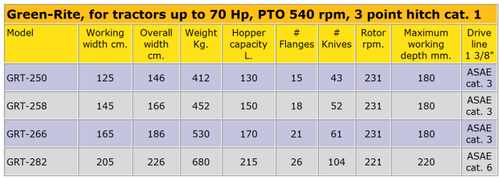 The machine is equipped with an aerator rotor powered by the tractor PTO; its straight blades on narrow flanges allow the implement to overseed with minimum damage to existing turf. A tilling rotor with "C" blades is available upon request and may be mounted in place of the straight blade aerator rotor. This converts the Green-Rite into a tiller for seed bed preparation which tills, seeds and compacts the soil in a single pass. Changing the machine over from an aerator to a tiller is a simple operation which can be performed in a few minutes with a pair of wrenches. The Green-Rite is available in four sizes, 125, 145, 165 & 205 cm. Optional equipment: (click here!).
